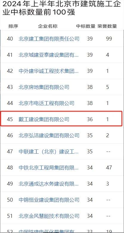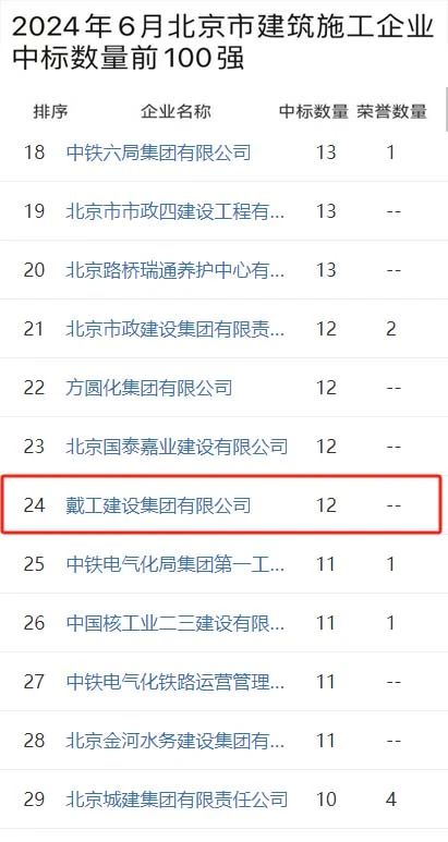 時間推進到2024年6月,戴工集團更是迎來了單月的高光時刻。在這個關鍵月份,戴工集團憑借出色的項目策劃和執(zhí)行能力,一舉將排名提升至北京市建筑施工企業(yè)中標數(shù)量前100強的第24位。這一成績的取得,充分展示了戴工集團在短期內的快速響應能力和高效執(zhí)行力,也為其在市場上的進一步拓展奠定了堅實基礎。
