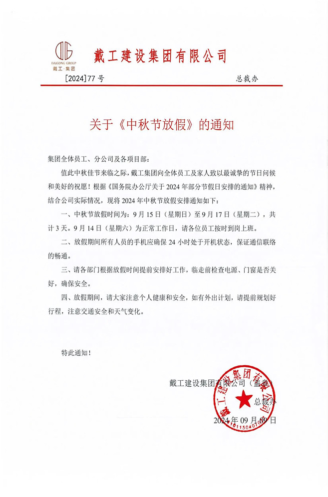 在此,戴工集團再次向全體員工及家人致以最誠摯的中秋祝福!愿大家在這個團圓的日子里與家人共度美好時光,同時也期待大家以更加飽滿的熱情和充沛的精力投入到后續(xù)的工作中,共同推動公司的發(fā)展邁上新的臺階!