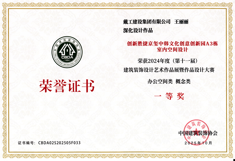 榮譽加身,砥礪前行。未來,戴工建設(shè)集團將以此次獲獎為契機,繼續(xù)深耕建筑裝飾領(lǐng)域,持續(xù)激發(fā)設(shè)計創(chuàng)新活力,提升工程施工品質(zhì),為客戶打造更多兼具功能性與藝術(shù)性的優(yōu)質(zhì)項目,為推動建筑裝飾行業(yè)的高質(zhì)量發(fā)展貢獻力量!